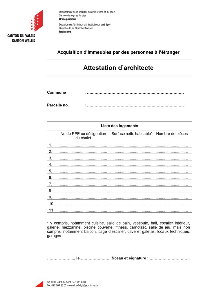 En Suisse, l’achat d’un bien immobilier par une personne étrangère (sans permis d’établissement suisse) est encadré par la Loi fédérale sur l’acquisition d’immeubles par des personnes à l’étranger (LFAIE, aussi appelée « Lex Koller »). Cette loi impose des conditions strictes, notamment sur la surface habitable du bien. Pour vérifier que ces conditions sont respectées, le canton exige une attestation signée par un architecte qui certifie les surfaces réelles du logement.
